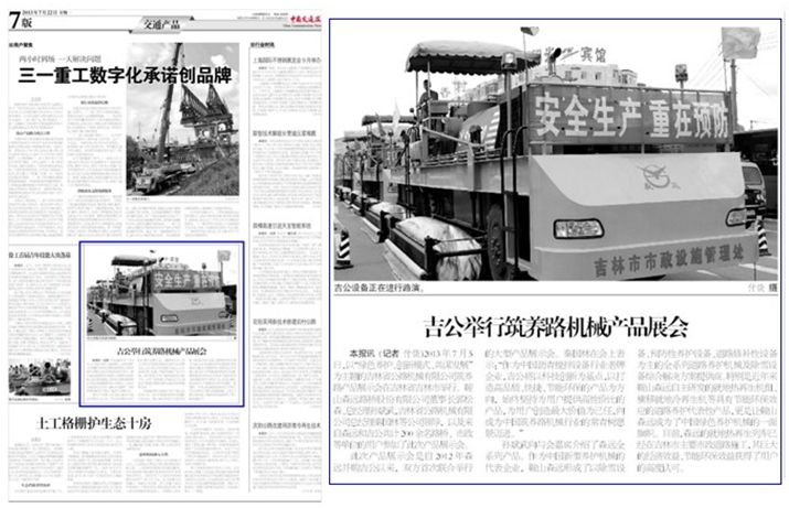 展示會(huì)得到諸多網(wǎng)絡(luò)媒體紛紛報(bào)道的同時(shí),主流媒體平臺(tái)《中國交通報(bào)》也于2013年7月22日第七版對(duì)此次展會(huì)進(jìn)行了報(bào)道,高度肯定了森遠(yuǎn)、吉公在綠色筑養(yǎng)路行業(yè)新發(fā)展形勢下的旗幟作用,充分見證了森遠(yuǎn)、吉公以諸多代表性產(chǎn)品服務(wù)市政道路建設(shè)、贏得行業(yè)市場、獲得用戶認(rèn)可的不爭事實(shí)。